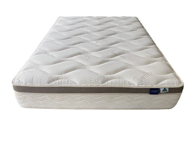 The sleep surface is finished with a Natural Bamboo Textile Cover, selected for its moisture-wicking, thermoregulating, and antimicrobial properties.