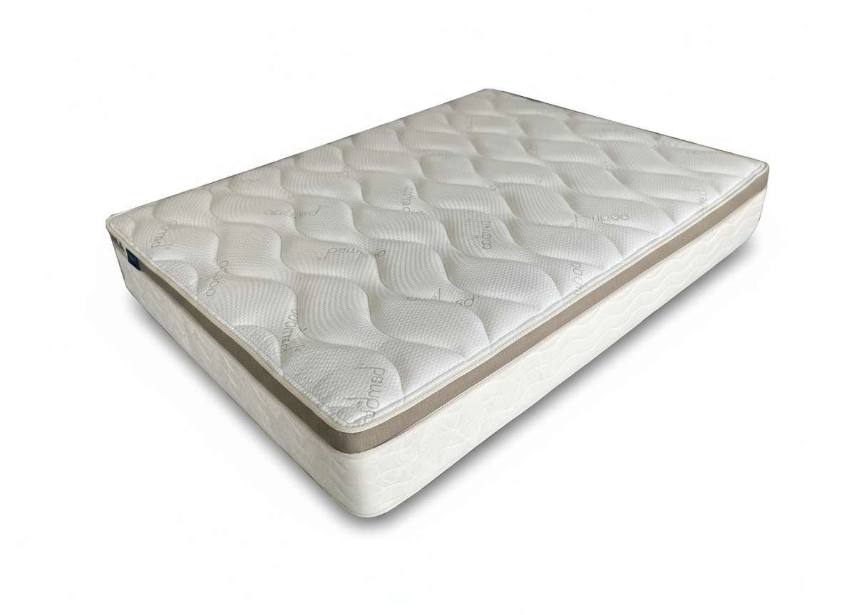 The sleep surface is finished with a Natural Bamboo Textile Cover, selected for its moisture-wicking, thermoregulating, and antimicrobial properties.